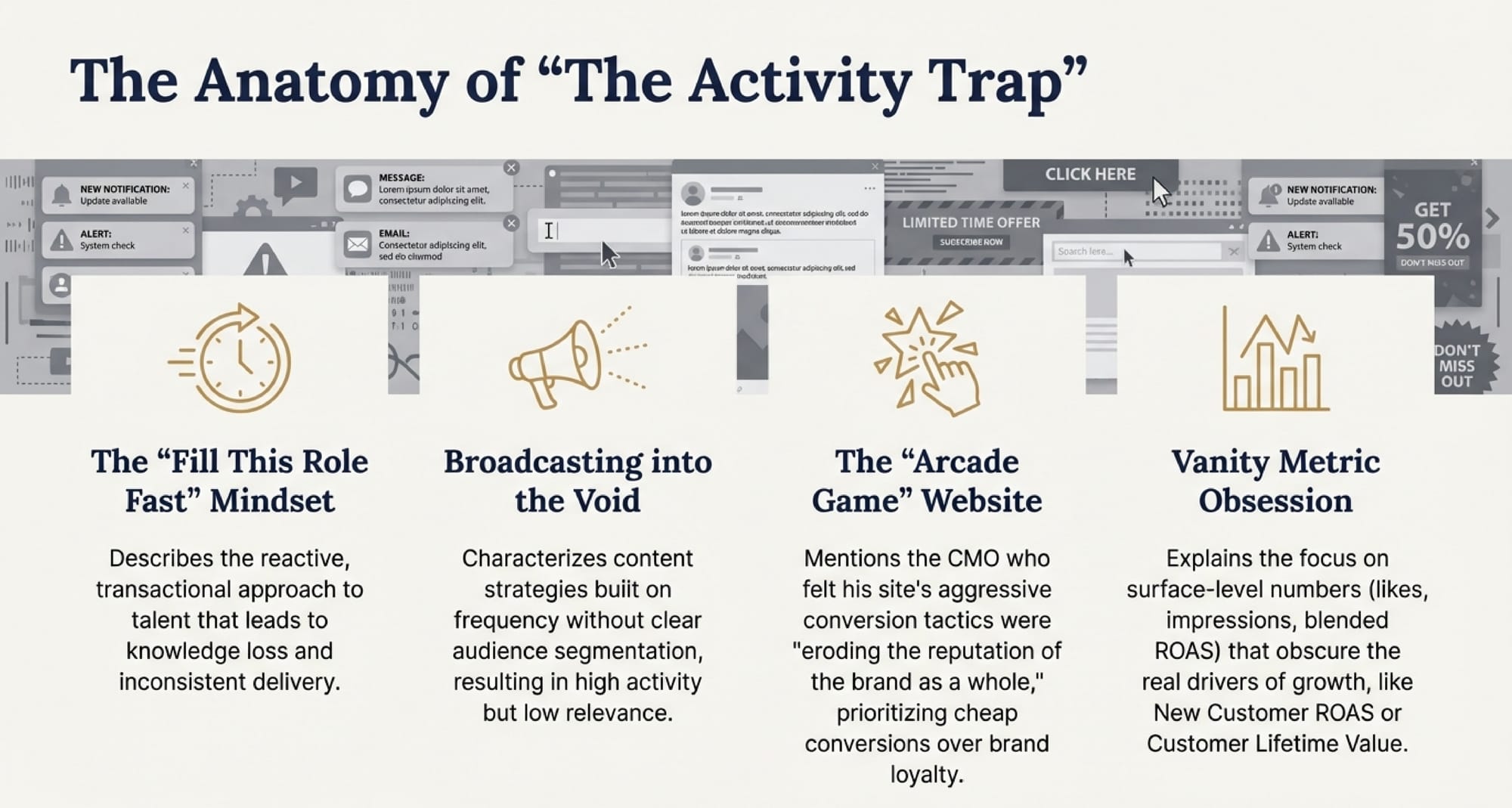 Most organizations are currently stuck in the Activity Trap. This is characterized by a reactive, transactional mindset—filling roles fast, broadcasting generic content into the void, and obsessing over "vanity metrics" like likes or impressions that don't actually drive growth.