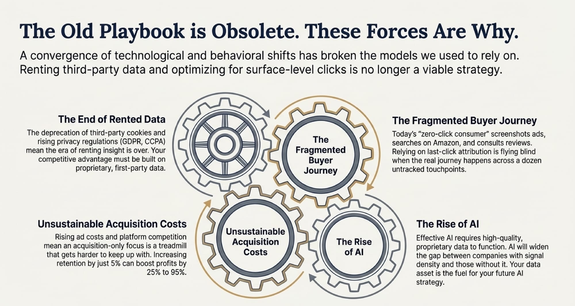 - The End of Rented Data: Privacy regulations (GDPR, CCPA) and the death of third-party cookies mean you can no longer rely on buying insights.