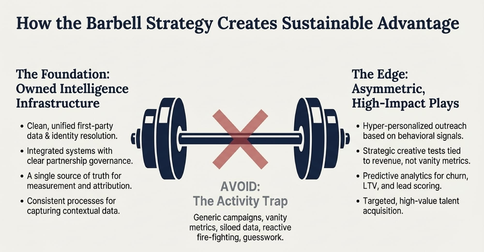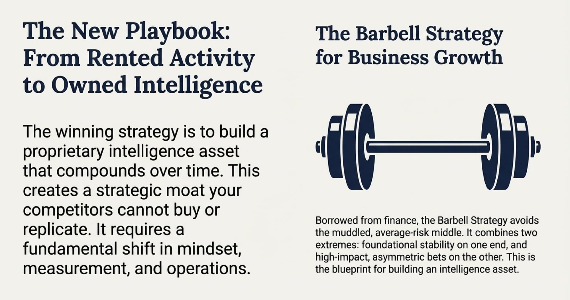 To survive this shift, we look to a concept from finance: The Barbell Strategy. Instead of settling for a "muddled middle" of average risk and average results, the Barbell Strategy balances two extremes:
