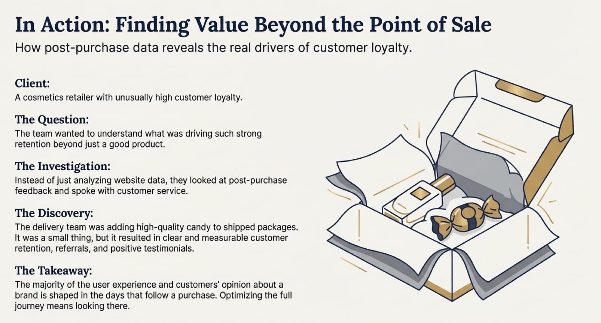 Imagine a cosmetics retailer found that their highest loyalty didn't come from the checkout page, but from a small "post-purchase" detail: adding high-quality candy to shipped packages. This small touch-point drove referrals and testimonials that no "urgent" pop-up could ever match.