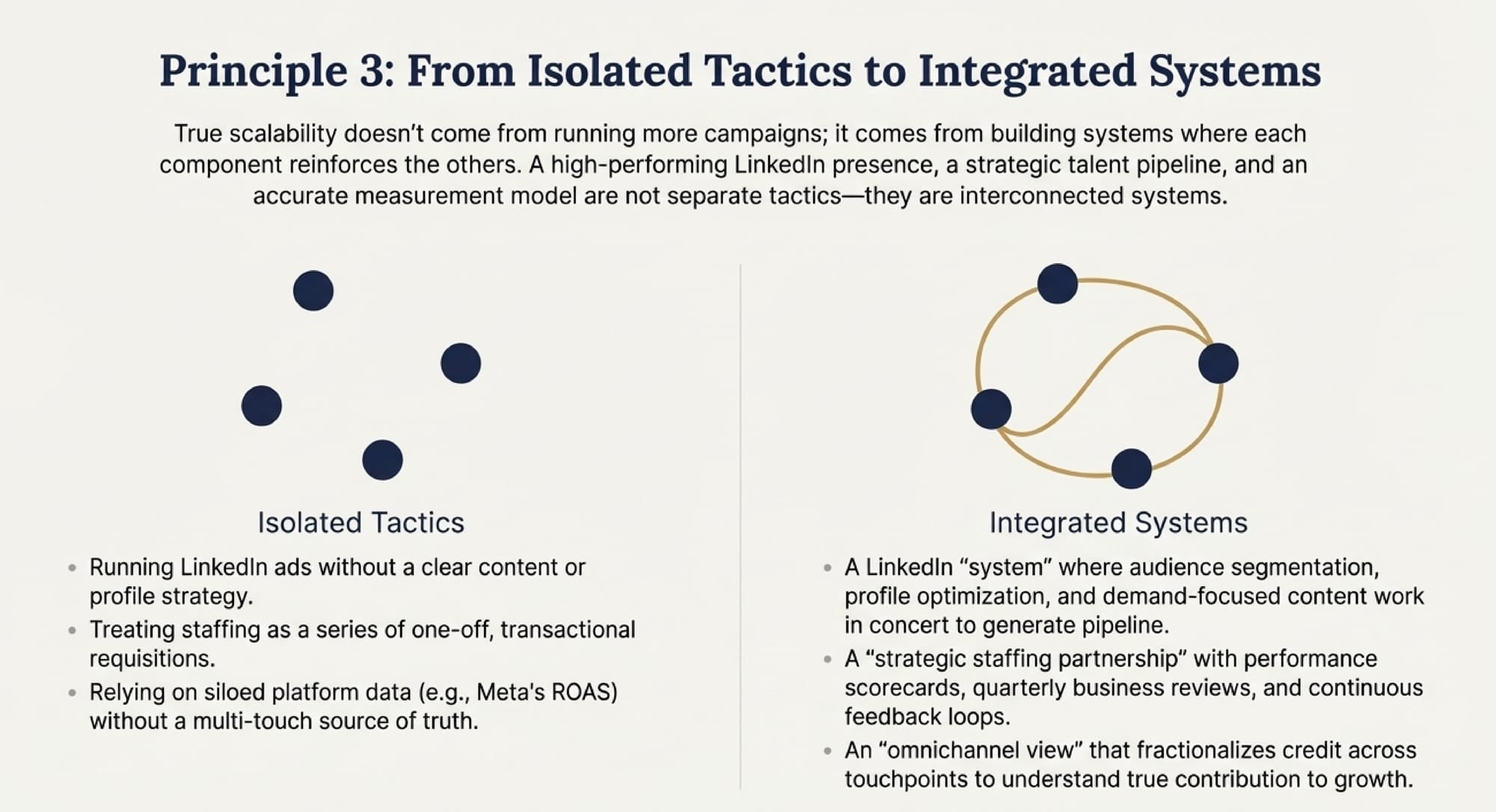 Scalability doesn't come from running more campaigns; it comes from building integrated systems. A high-performing LinkedIn presence, a talent pipeline, and an accurate measurement model should not be separate silos. They must be a connected network where each component reinforces the others.
