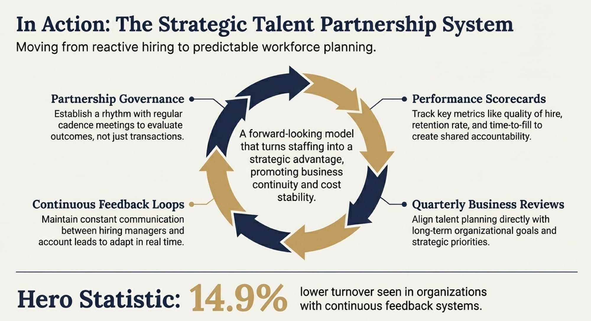 By implementing continuous feedback loops and performance scorecards, organizations can move toward predictable workforce planning. The results are measurable: organizations utilizing these continuous feedback systems see 14.9% lower turnover. This turns talent acquisition from a cost center into a forward-looking model that promotes business continuity.