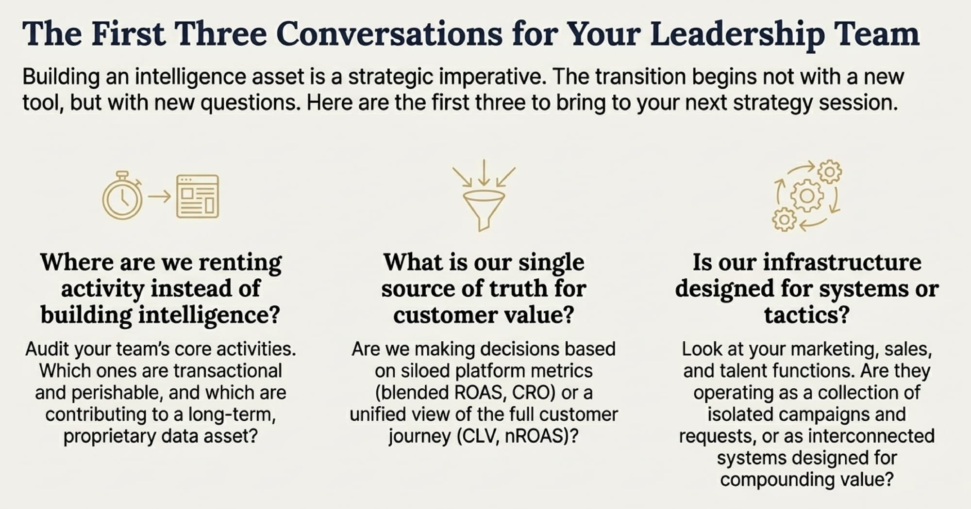 To move away from the "Activity Trap" and toward a compounding intelligence asset, bring these three questions to your next strategy session: