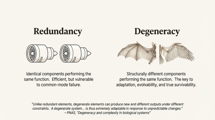 Crucially, this architecture moves beyond simple redundancy (using identical copies) toward the more sophisticated biological principle of degeneracy. The source paper notes that error correlation between agents can be reduced by using different model families or varying generation temperature. By assembling a council of diverse agents—structurally different components that can perform the same function—the system ensures that even if one type of model has a systemic blind spot, the others will compensate. This is a far more resilient strategy than relying on identical, but identically flawed, components.