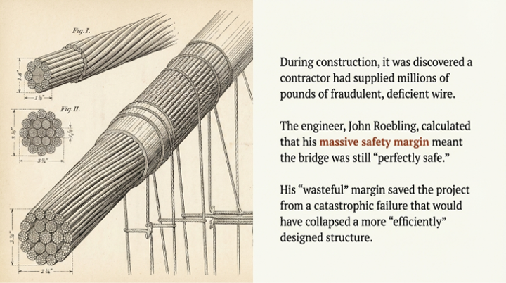 Faced with a potentially catastrophic flaw, chief engineer Washington Roebling made a decision that defied conventional logic. Instead of attempting the Herculean task of unwinding and replacing the compromised wire, he ordered 14 tons of extra wire to be added to the cables, at the fraudulent supplier's expense. His confidence came not from perfection, but from a profound engineering principle: an immense, almost profligate, safety margin. The bridge had been designed with a "Six-to-One design factor," meaning it was built to be six times stronger than it needed to be. This massive buffer was designed for the unknown, and a secret fraud—much like the thousands of experimental "Brady splices" also hidden in the cables—was exactly the kind of unknown it was meant to absorb.