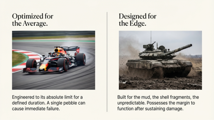 Consider the mechanical contrast between a Formula 1 racing car and a main battle tank. The F1 car is the pinnacle of optimization. Every component is engineered to operate at its absolute limit on a pristine, predictable track. It has zero margin for error; a single pebble can shatter its suspension, leading to immediate, catastrophic failure. The tank, by contrast, is a de-optimized beast. It is heavy, inefficient, and overbuilt—and for that reason, it is robust. It can absorb shocks and continue its mission. For the last several decades, we have been building F1 cars for a world full of unexpected obstacles.