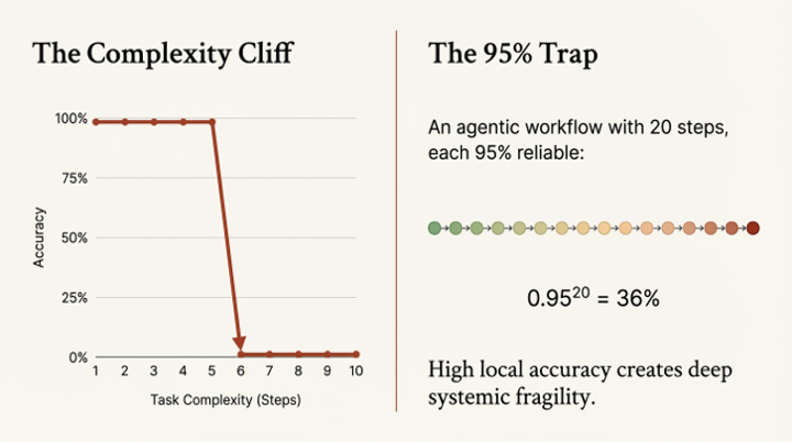 The mathematical reality is brutal. An AI agent might be tasked with a ten-step process, such as analyzing a customer request, searching a database, cross-referencing a policy manual, drafting a response, and logging the interaction. If we assume each individual step has a 95% success rate—a score that would be celebrated on most academic leaderboards—the probability of the entire ten-step workflow succeeding is not 95%. It is 0.95 to the 10th power, which is less than 60%. With twenty steps, the success rate plummets to just 36%. The probability of success decays geometrically, turning a series of seemingly reliable components into a deeply unreliable system.